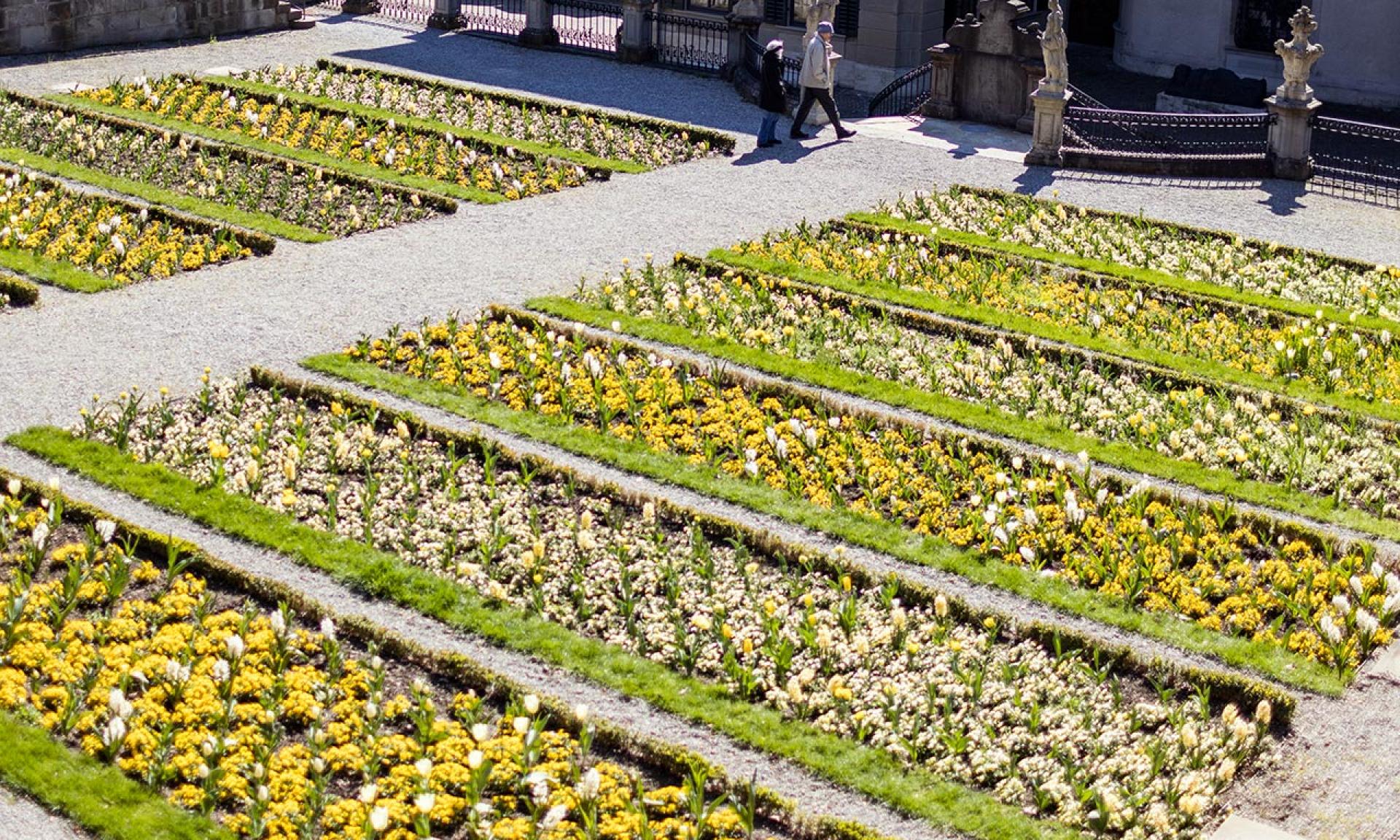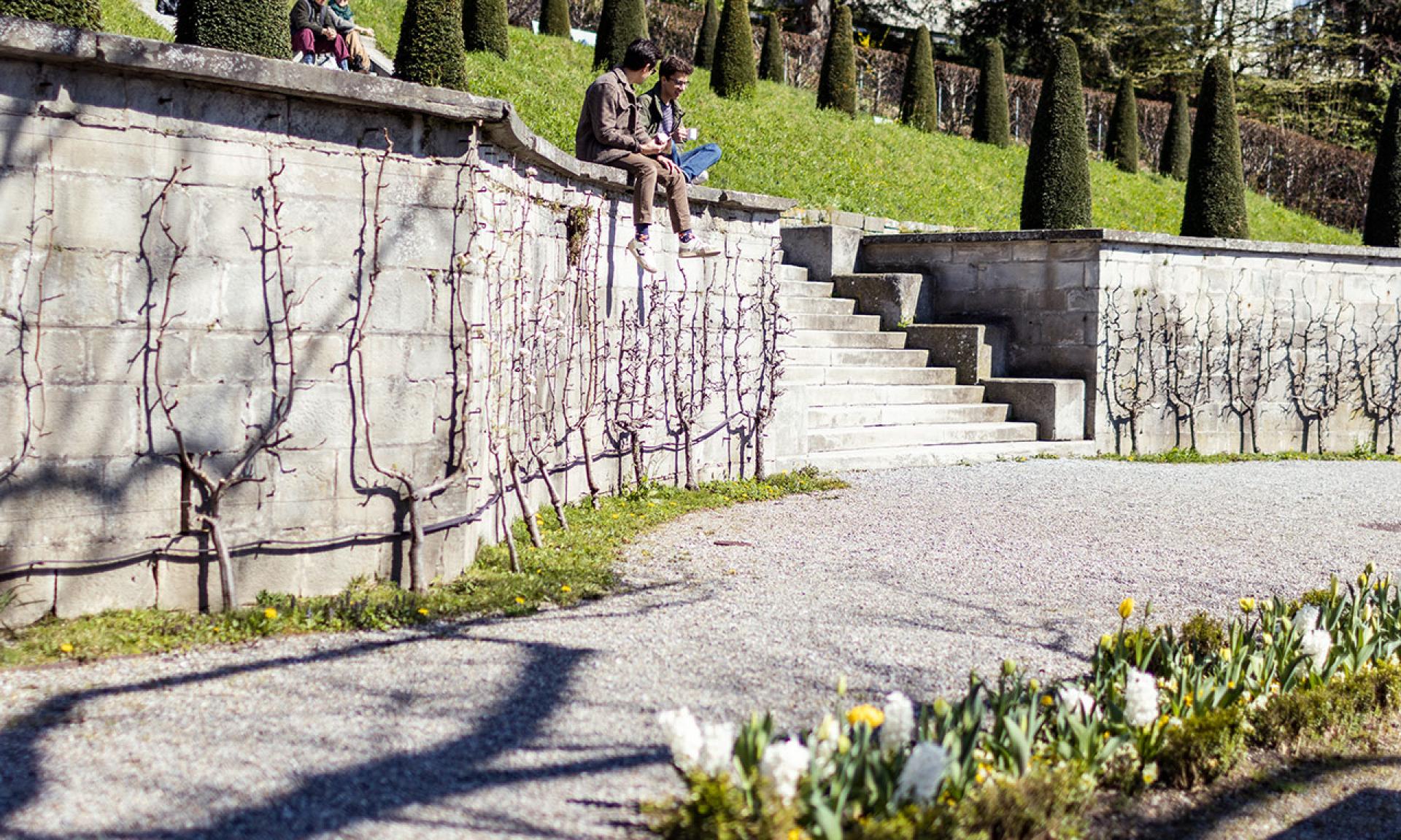 Wer bei der Haltestelle Neumarkt aussteigt, findet den Eingang zum Park nach nur wenigen Schritten den Hang hinauf. Nun eröffnet sich der Blick auf die prächtige Gartenanlage, die sich auf Terrassen nach oben hin öffnet. 1790 entworfen, sind heute noch die generelle Aufteilung in Hof, Parterre und Terrassen erhalten sowie auch die Mauern, Brunnen und die erweiterte Orangerie. Dazwischen tummeln sich Student:innen, Tourist:innen und Einheimische.