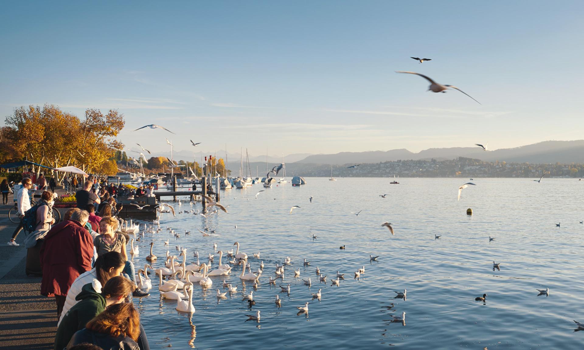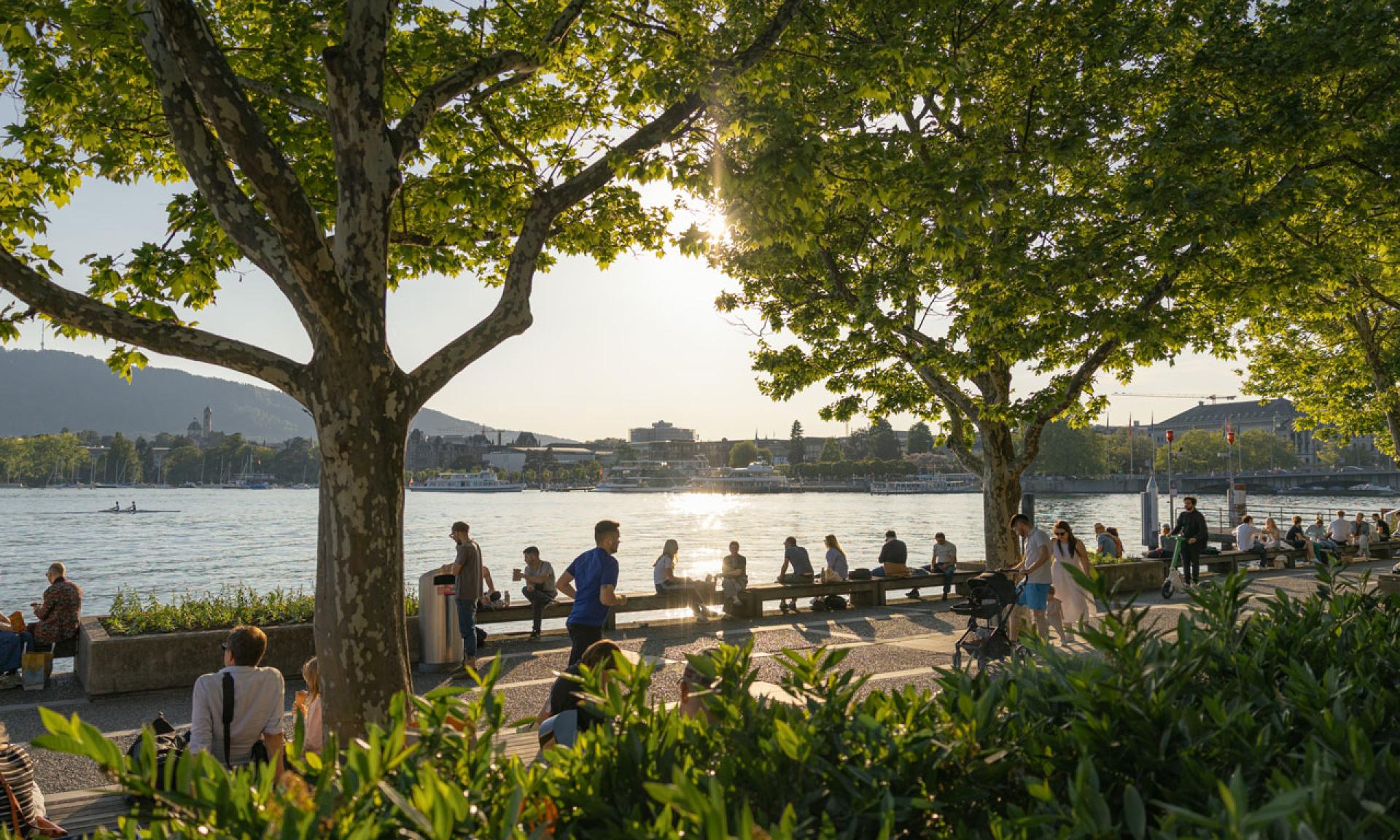 Die Quaianlagen umranden mit einer prachtvollen Promenade das untere Becken des Zürichsees. Hier treffen sich im Sommer alle zum fröhlichen Stelldichein.