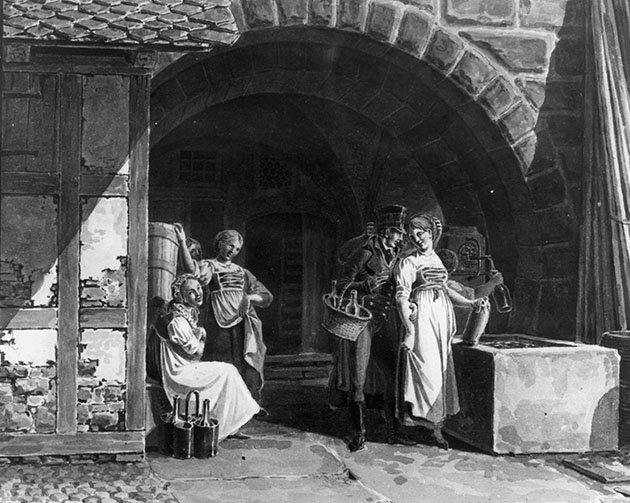 In unserer Musikgruppe sitzen zum Beispiel ein Pfarrer und seine Frau. Pfarrer Jakob Christoph Hug, geboren 1776 in Zürich, wirkt seit 1798 in Thalwil; seine Frau Barbara Schulthess ist die Nichte von Pestalozzis Gattin. Und mit ihnen ist ein junger Feuerkopf, der wunderbar Harfe spielt und die Damen entzückt: Hans Georg Nägeli, geboren 1773. Er stammt aus Wetzikon und kommt 1790 mit wenig Geld nach Zürich, er begeistert sich sogleich für die Musik und eröffnet bereits 1791 an der Augustinergasse – mit dem Zustupf von Gönnern – eine Musikalien-Handlung und Leihbibliothek, die erste ihrer Art in der Schweiz.